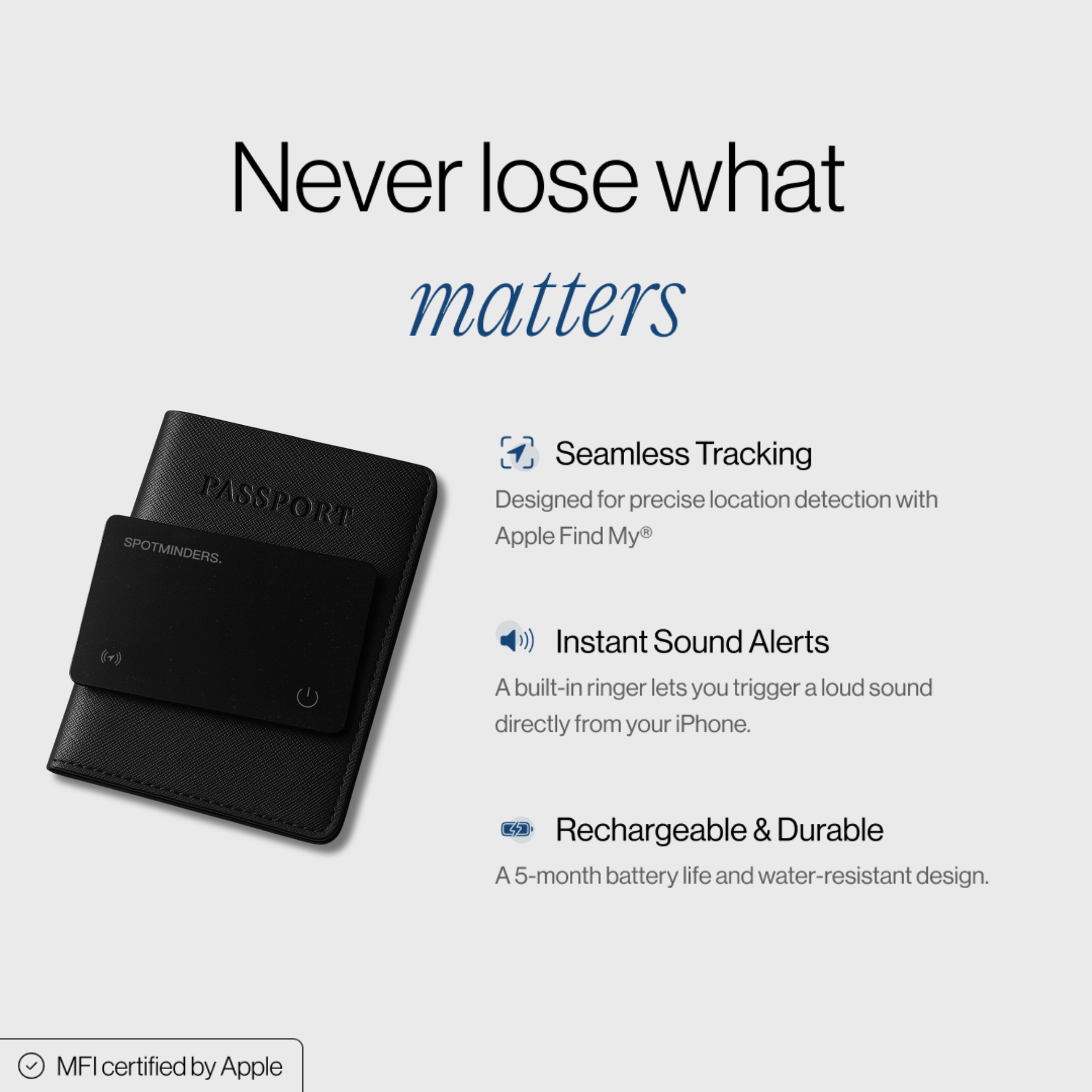 As an officially certified Apple MFI partner, Spotminders meets Apple's rigorous quality standards, ensuring: