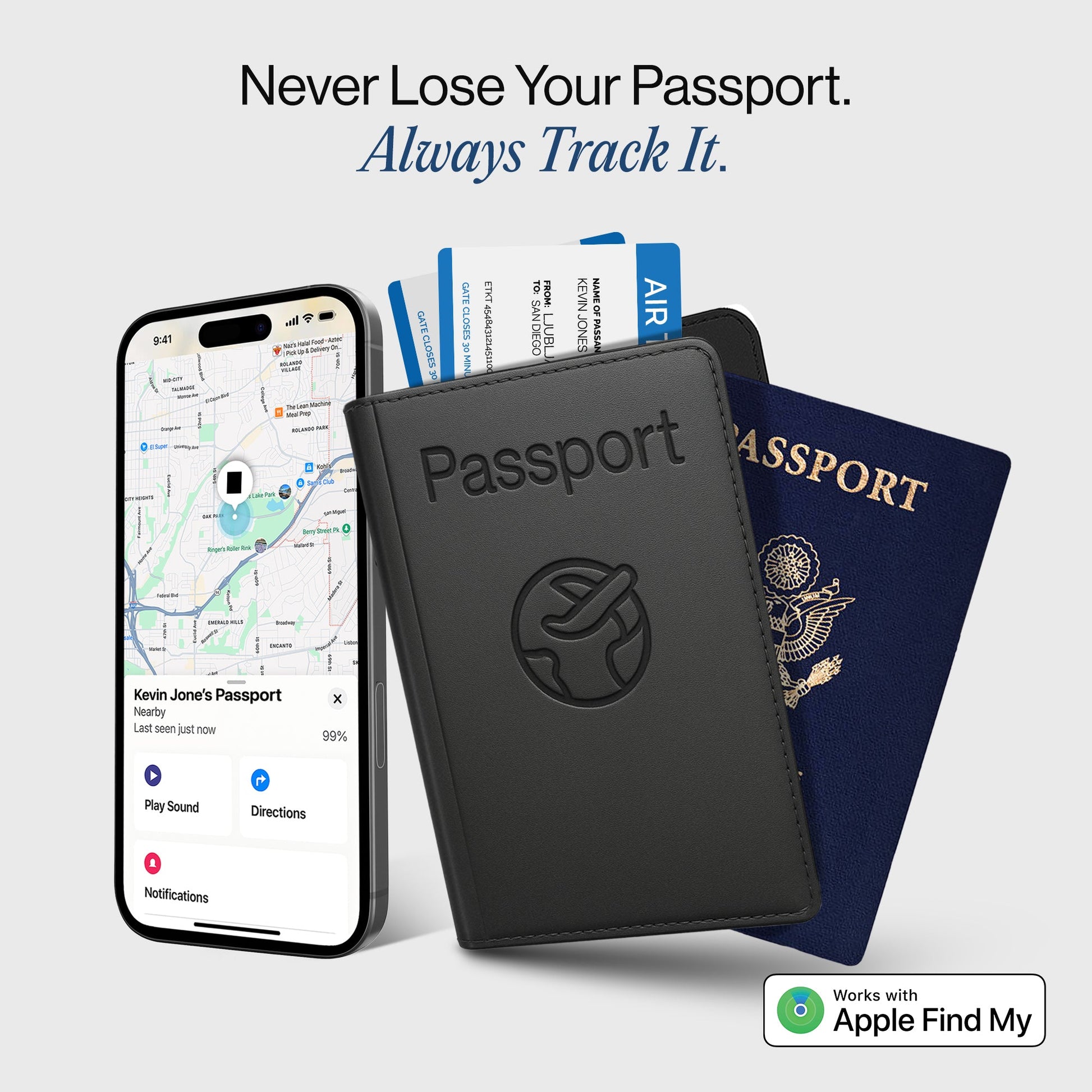 Our Trackable Passport Cover pairs instantly with Apple Find My.Slip your passport into the cover, and if it ever goes missing, you can view its location on your iPhone or play a sound to help you find it quickly.
